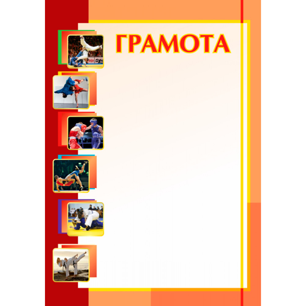 Грамота, формат А4. Бумага матовая, толщина 200 гр, полноцветная печать. ¶Фон грамоты бежевого цвета с красно-оранжевой широкой рамкой. В правой стороне рамка оранжевая, в левой- красная. В верхней части бежевого фона написано слово "Грамота" красным цветом с желтой обводкой. По левой стороне рамки сверху вниз изображены квадраты со спортсменами- борцами (каратэ, бокс, дзюдо и др.), квадраты со скругленными углами.