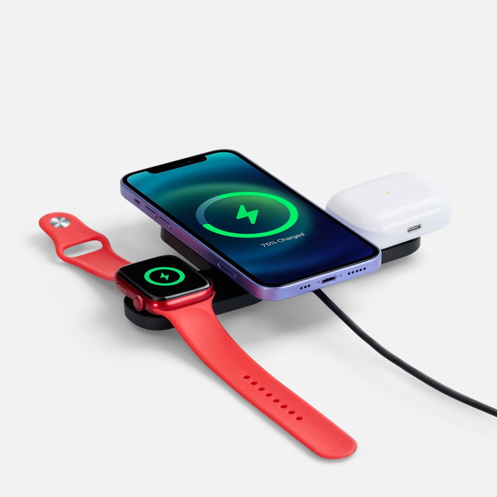 Trilogic — компактное устройство беспроводной зарядки для самых мобильных и современных пользователей. Площадки для зарядки наушников и часов легко складываются и не занимают много места, когда не используются: станцию удобно использовать не только в офисе, но и при разъездах.