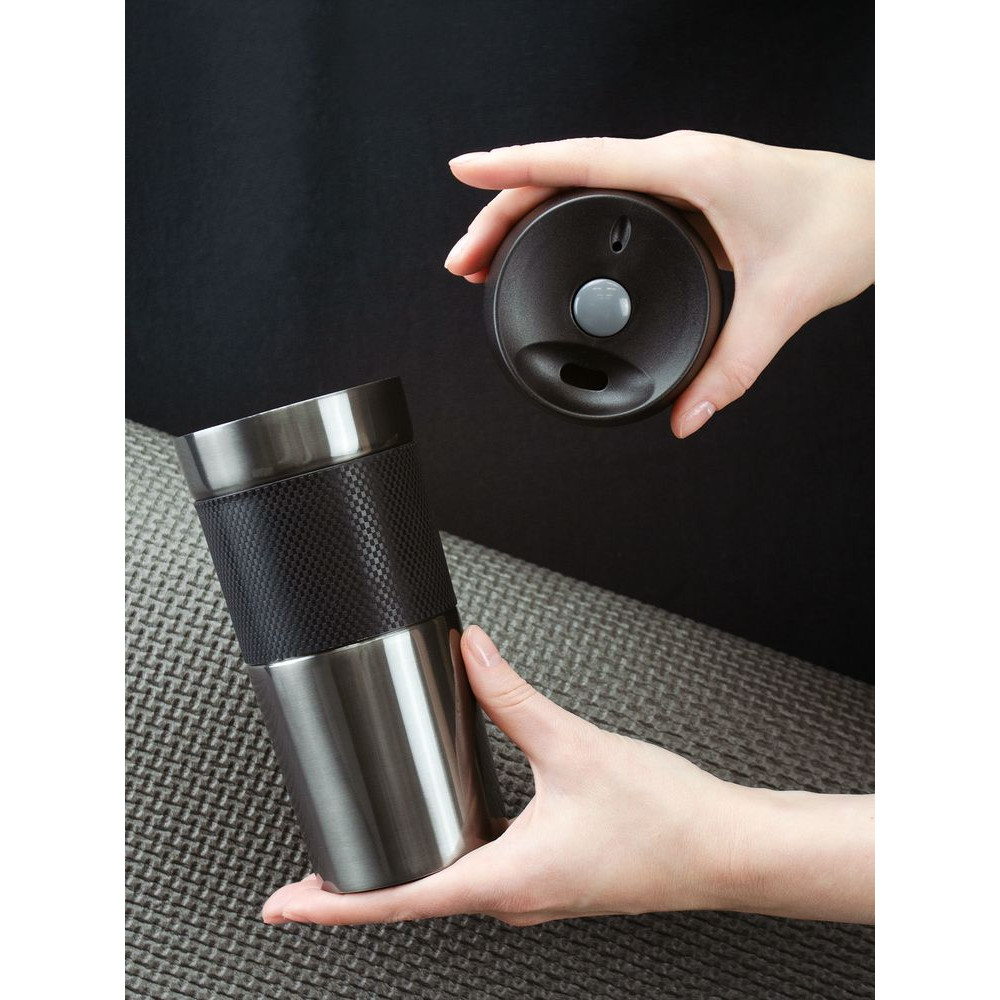 Двухслойная вакуумная конструкция из нержавеющей стали внутри и снаружи. Герметичная завинчивающаяся крышка с нажимным клапаном для питья.
