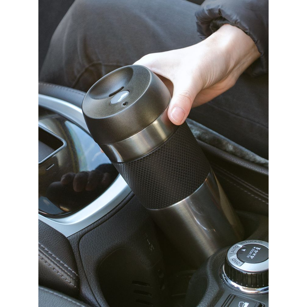 Удобная крышка с кнопкой-закрывашкой и силиконовая манжета на корпусе — все, что нужно, чтобы максимально комфортно пить чай или кофе в дороге.